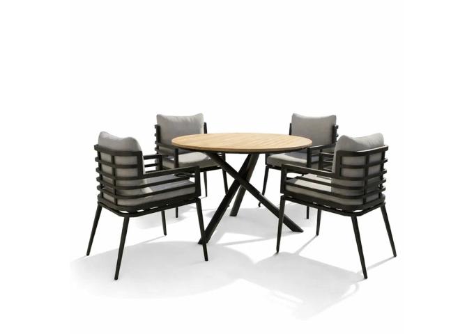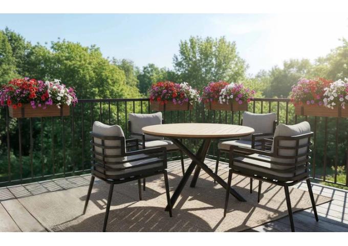 Ideal for family meals or summer evenings with friends, the Bucarest table features a stunning solid teak wood top resting on a modern, highly stable tripod base. It is paired perfectly with four lightweight yet incredibly sturdy Abella chairs. Complete with plush taupe cushions, this set creates an outdoor dining area that is both visually refined and highly functional.
