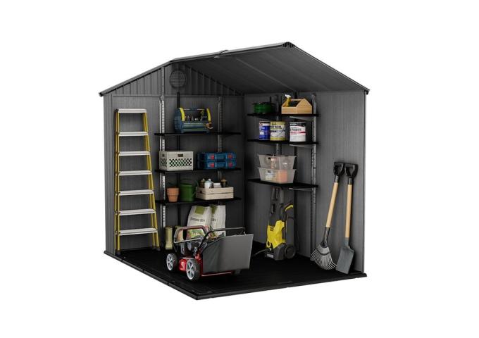 À l'intérieur, des caractéristiques de conception bien pensées, comme la ventilation intégrée, assurent la circulation de l'air, prévenant les odeurs de moisi et la condensation, ce qui est crucial pour protéger vos articles entreposés. L'inclusion d'une fenêtre et d'un puits de lumière inonde l'intérieur de lumière naturelle, facilitant la localisation des outils, de l'équipement de jardinage ou des décorations saisonnières sans tâtonner dans le noir. Avec un espace suffisant, l'abri Keter Darwin est parfait pour organiser tout, des tondeuses à gazon et vélos aux décorations de vacances et coussins de mobilier de jardin.